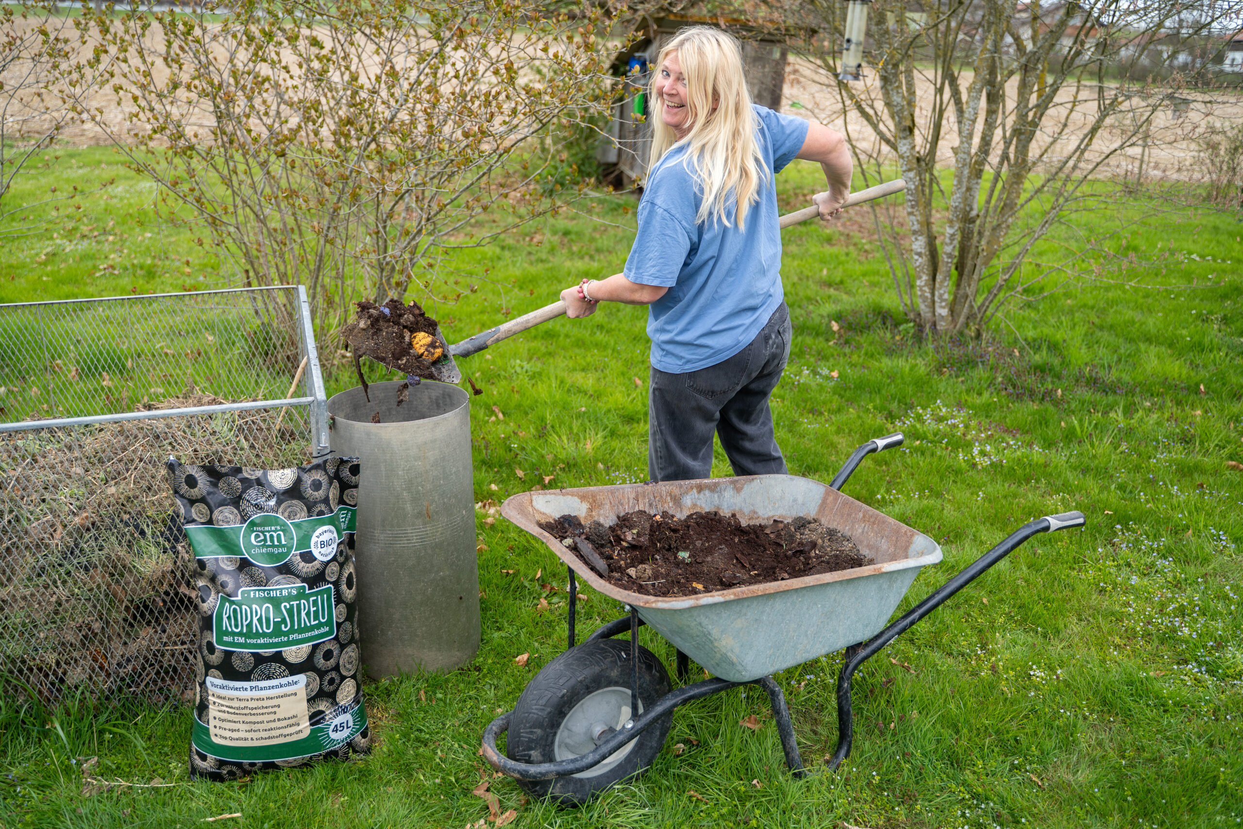 Eine Handvoll Schafwolle in die Erde einarbeiten. - Mikroorganismen Bodenagil– EM-Bodenaktivator – Dosiere bei der Mischung: 100 ml/10 L Wasser,